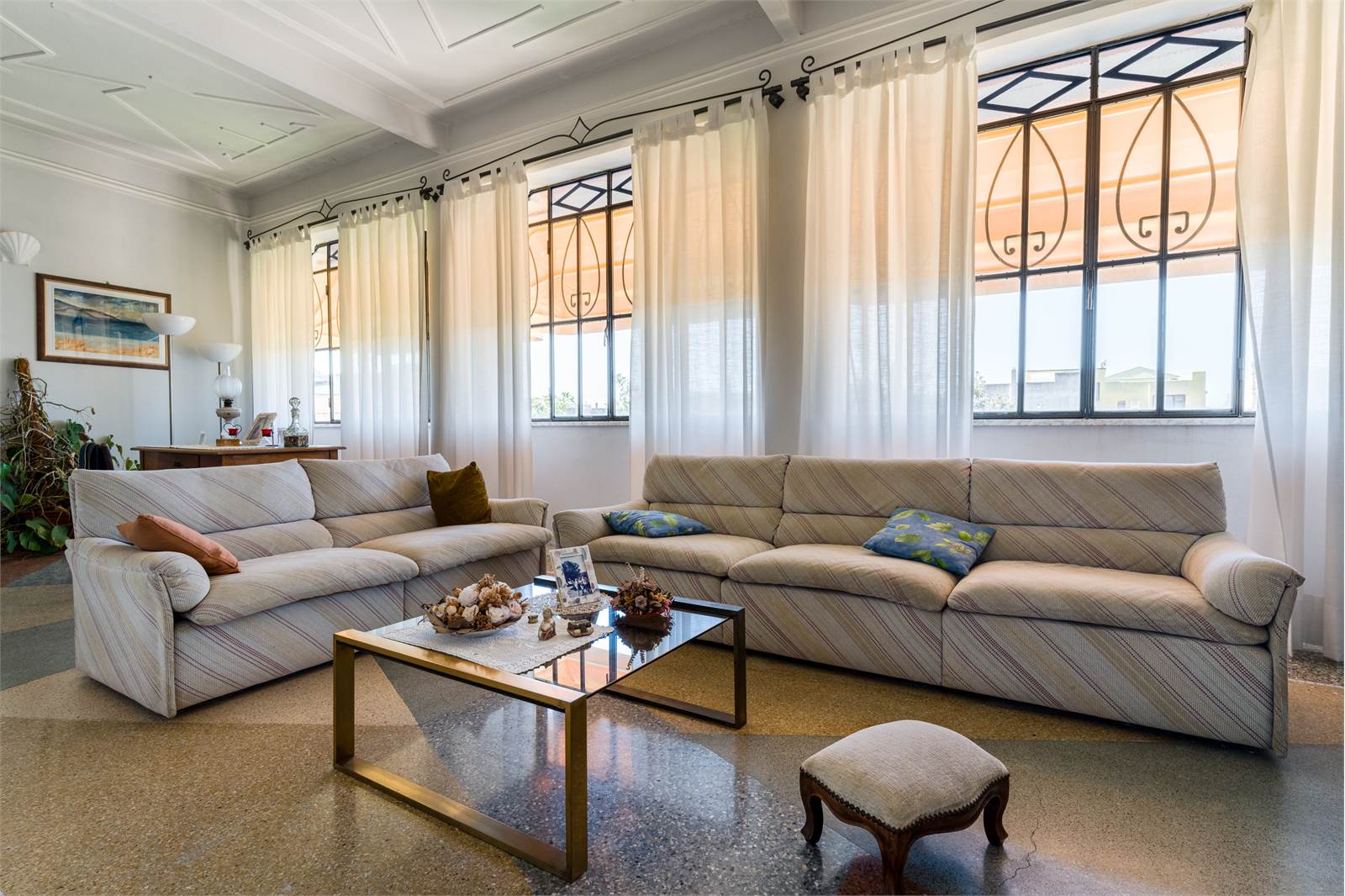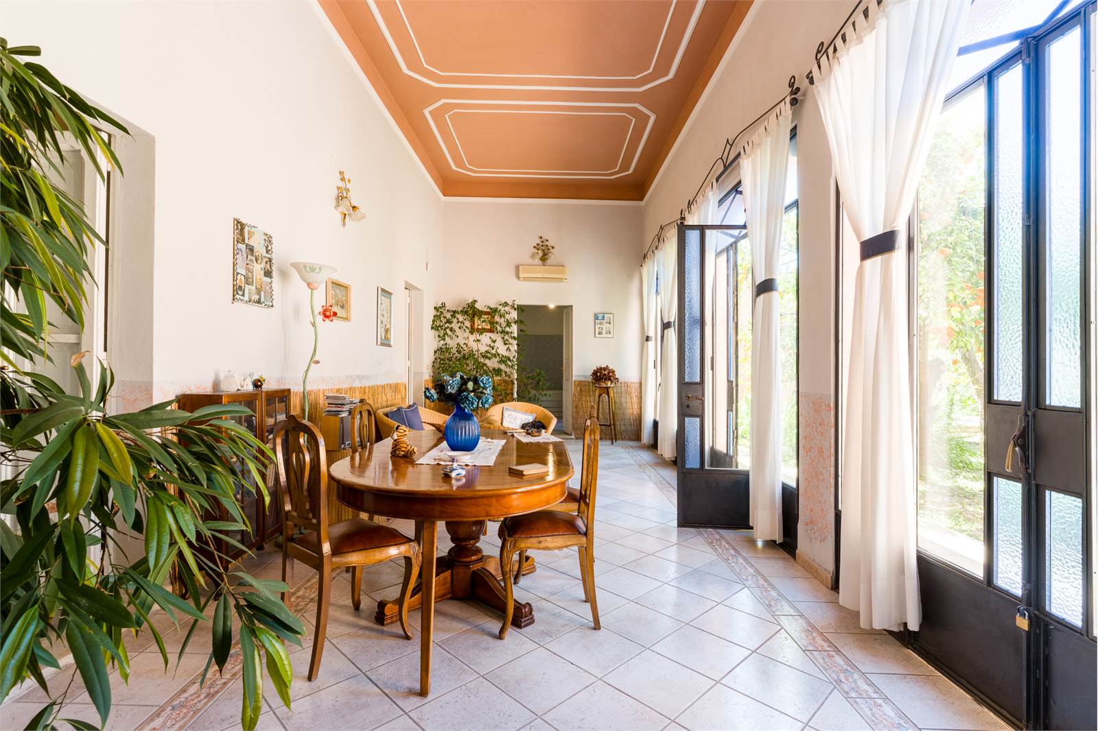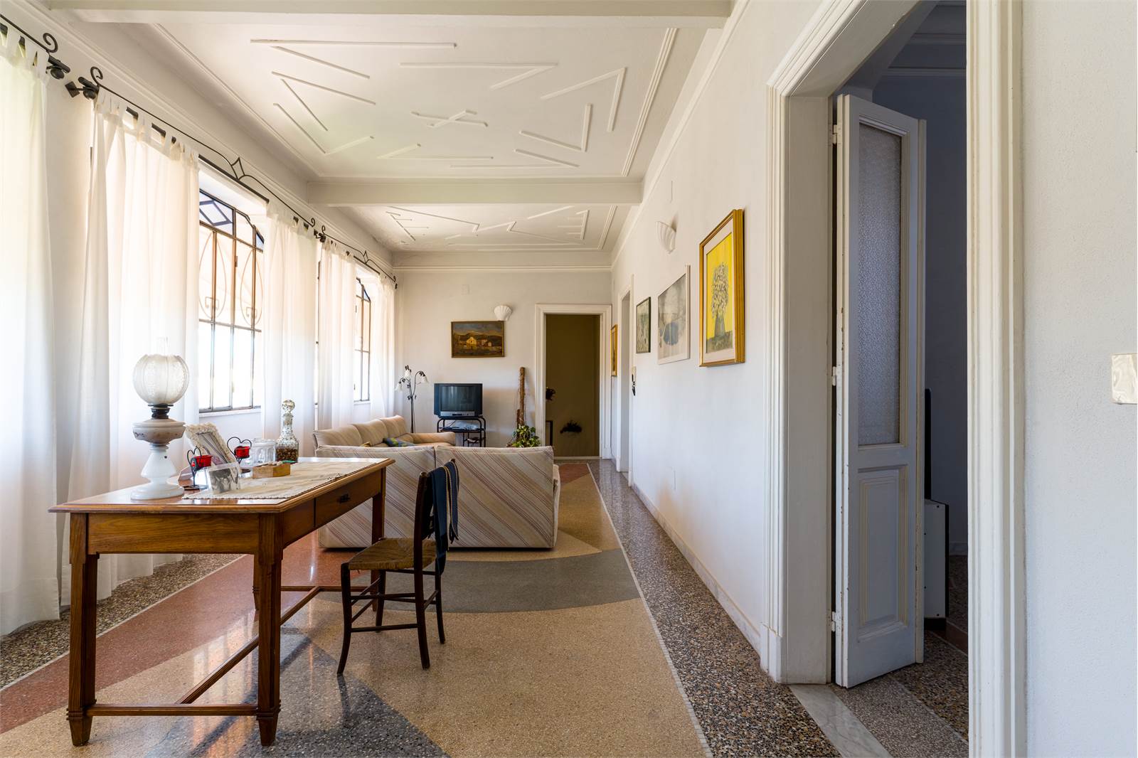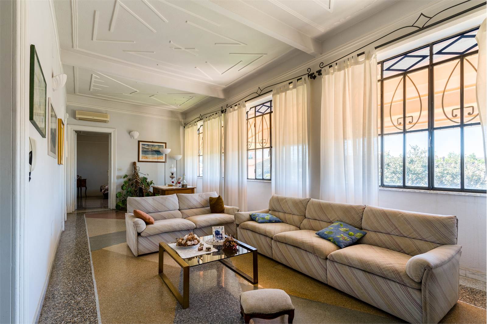 Il loggiato chiuso al piano terra — un ambiente lungo e luminoso con alte vetrate sul giardino, soffitto in cotto a cassettoni decorati e pavimento in maiolica — rappresenta il cuore conviviale della casa, affacciato direttamente sul verde. Adiacente, il soggiorno principale si sviluppa in lunghezza con doppio salotto, soffitti con modanature in gesso, ampie finestre con inferriate artistiche e pavimento in graniglia bicolore.