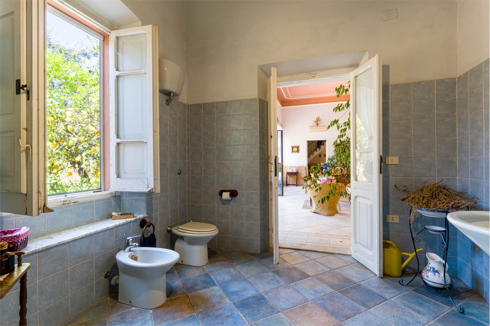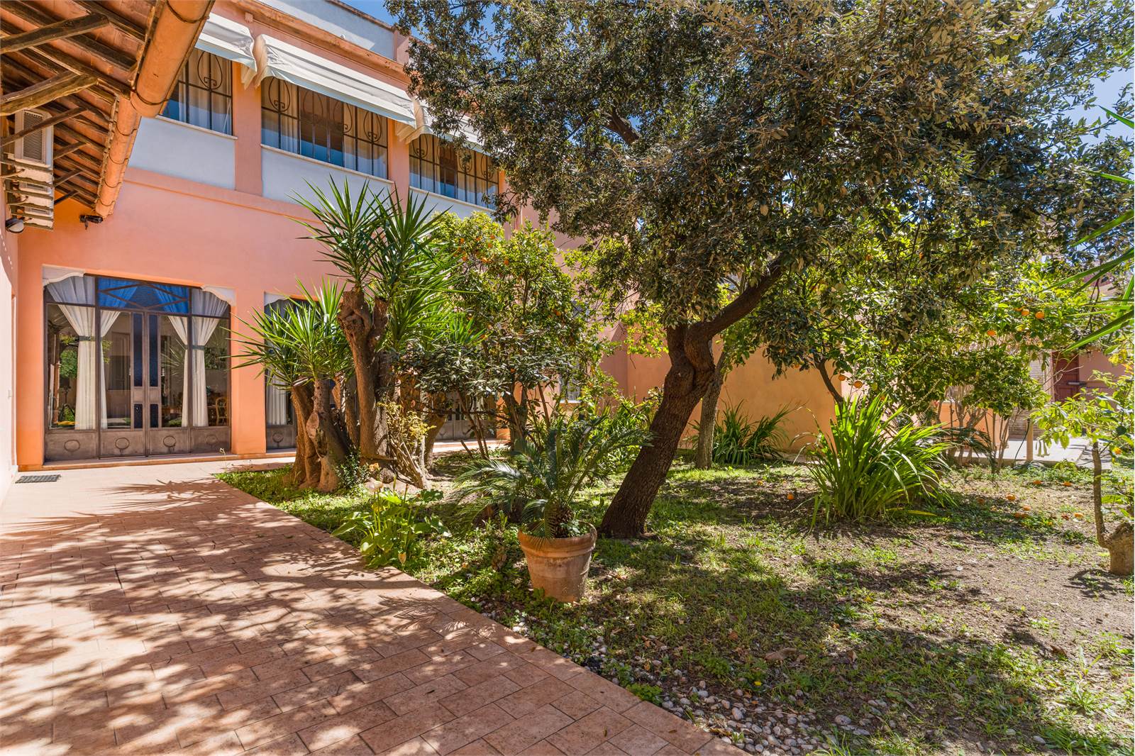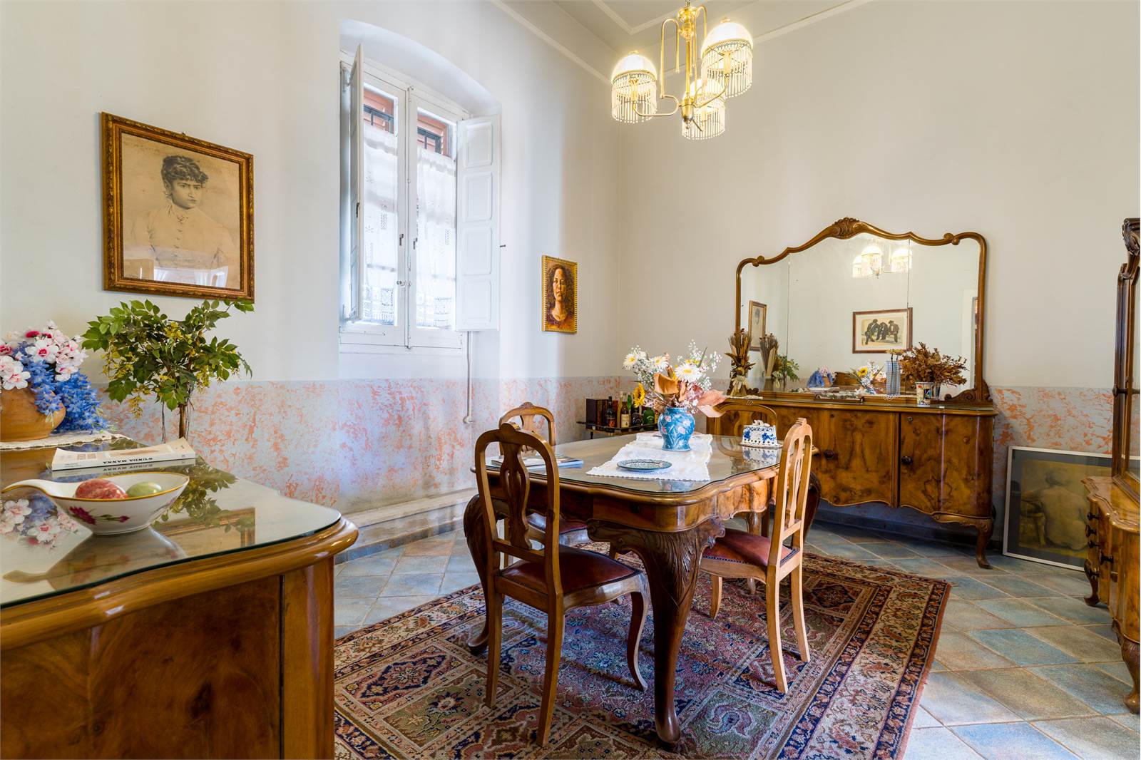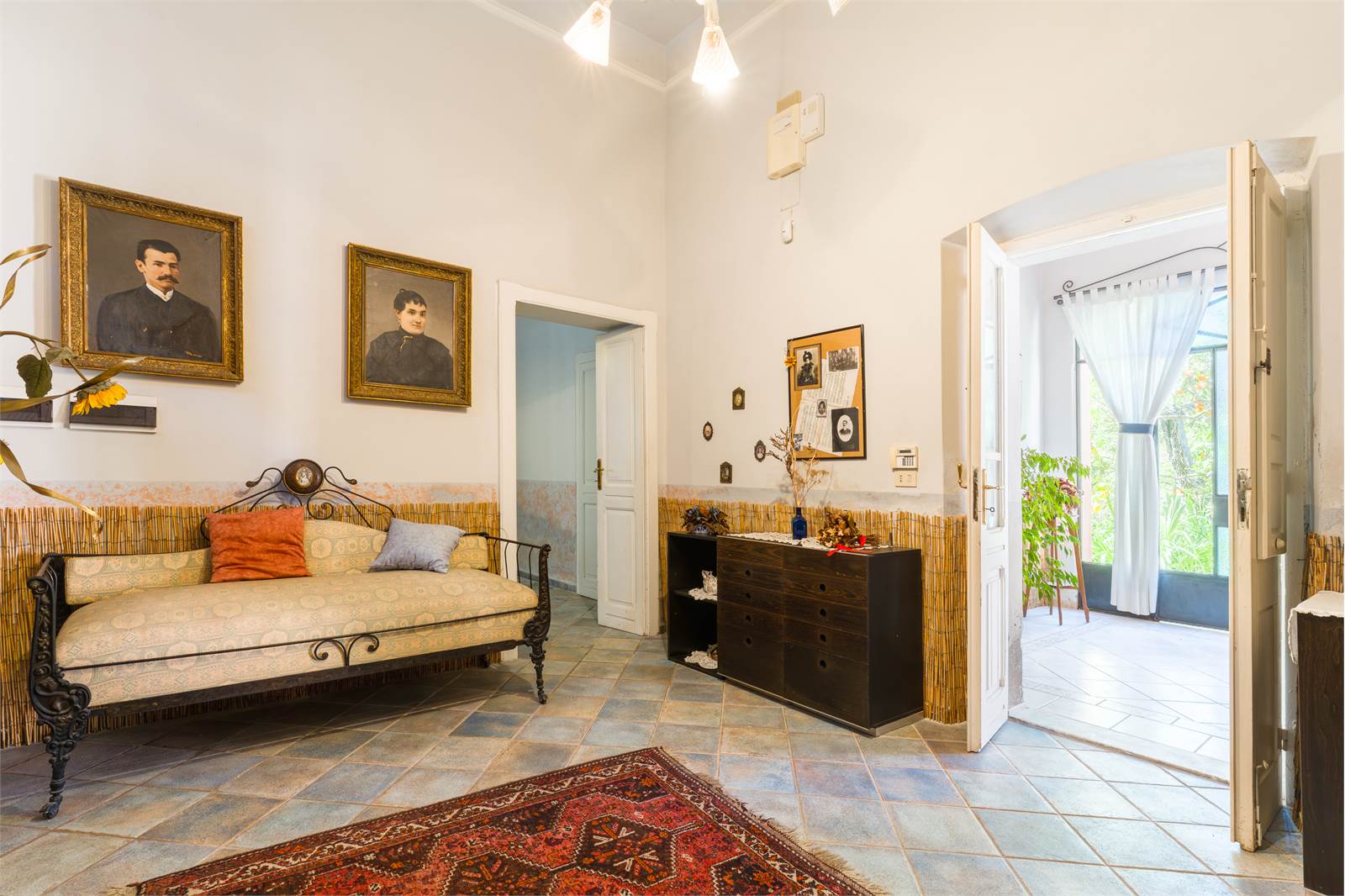 Il loggiato chiuso al piano terra — un ambiente lungo e luminoso con alte vetrate sul giardino, soffitto in cotto a cassettoni decorati e pavimento in maiolica — rappresenta il cuore conviviale della casa, affacciato direttamente sul verde. Adiacente, il soggiorno principale si sviluppa in lunghezza con doppio salotto, soffitti con modanature in gesso, ampie finestre con inferriate artistiche e pavimento in graniglia bicolore.