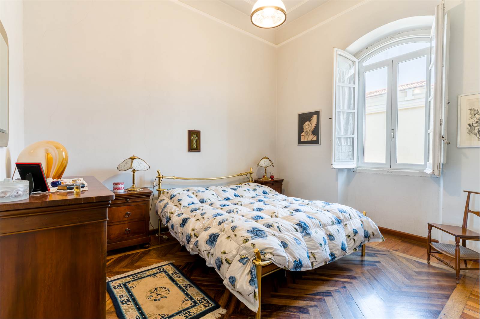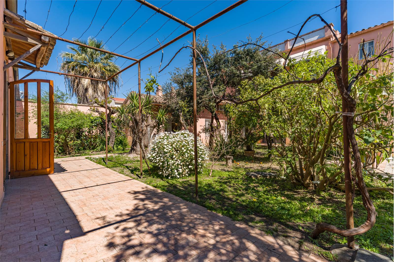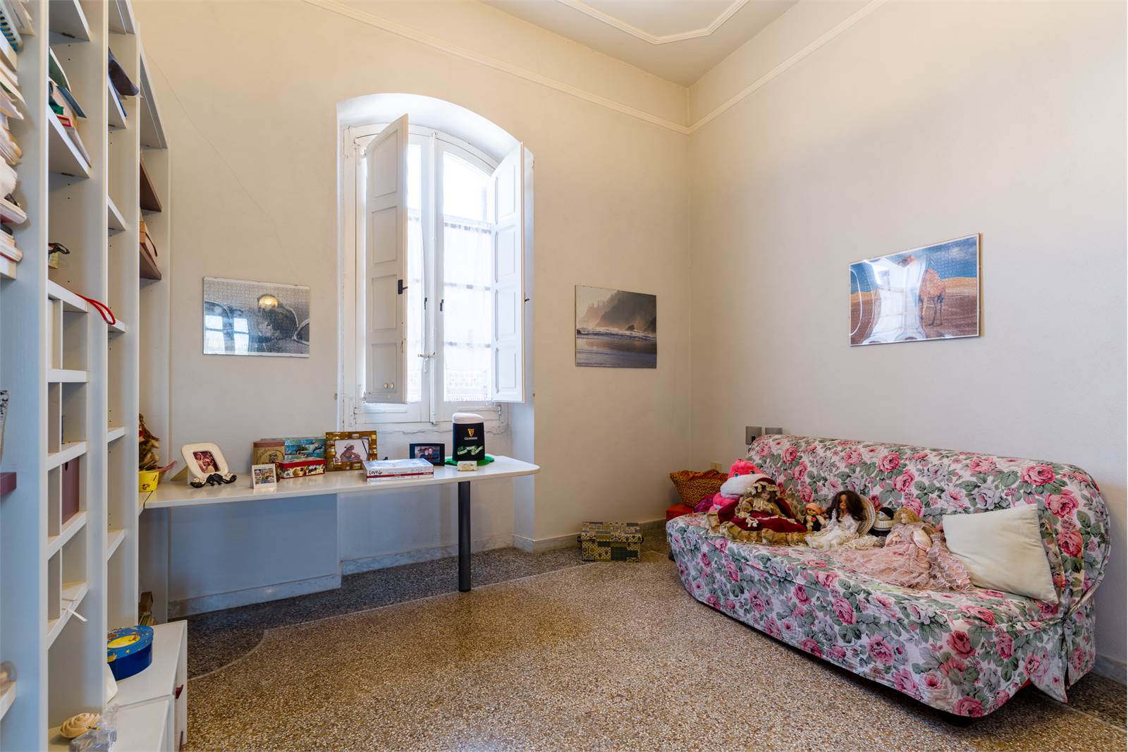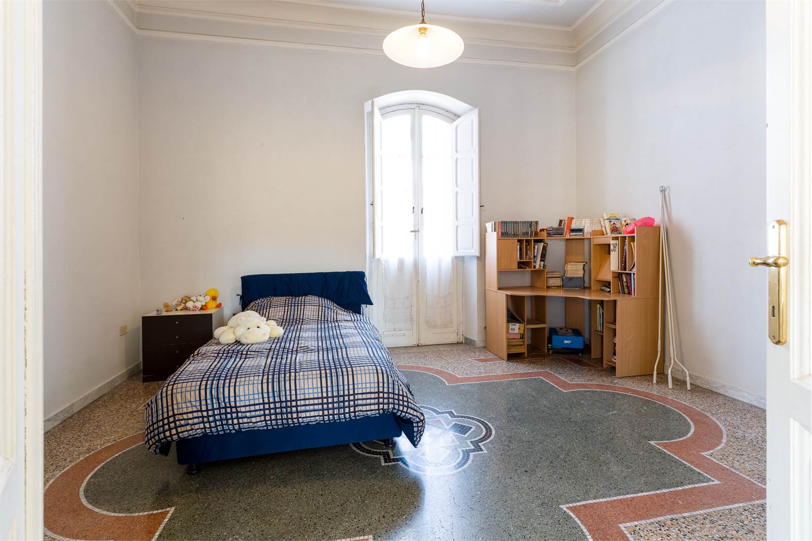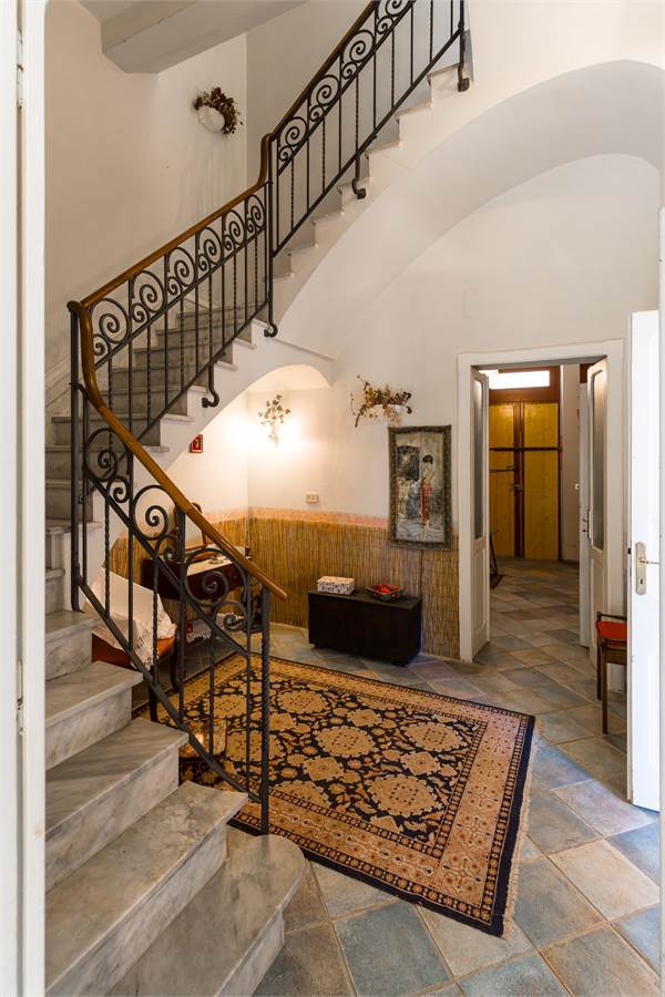 Gli interni conservano dettagli d'epoca di raro pregio: soffitti decorati con cornici in stucco e riquadrature geometriche dipinte, infissi in ferro battuto lavorato con archetti e motivi floreali, pavimenti in graniglia e marmo lucidato. Ogni ambiente racconta la cura costruttiva di un'epoca in cui l'architettura era anche arte.