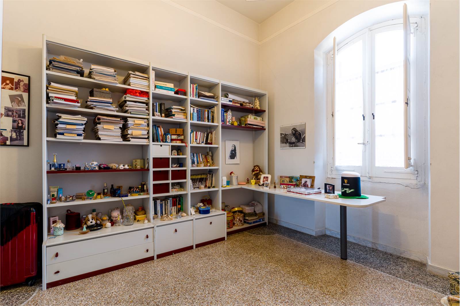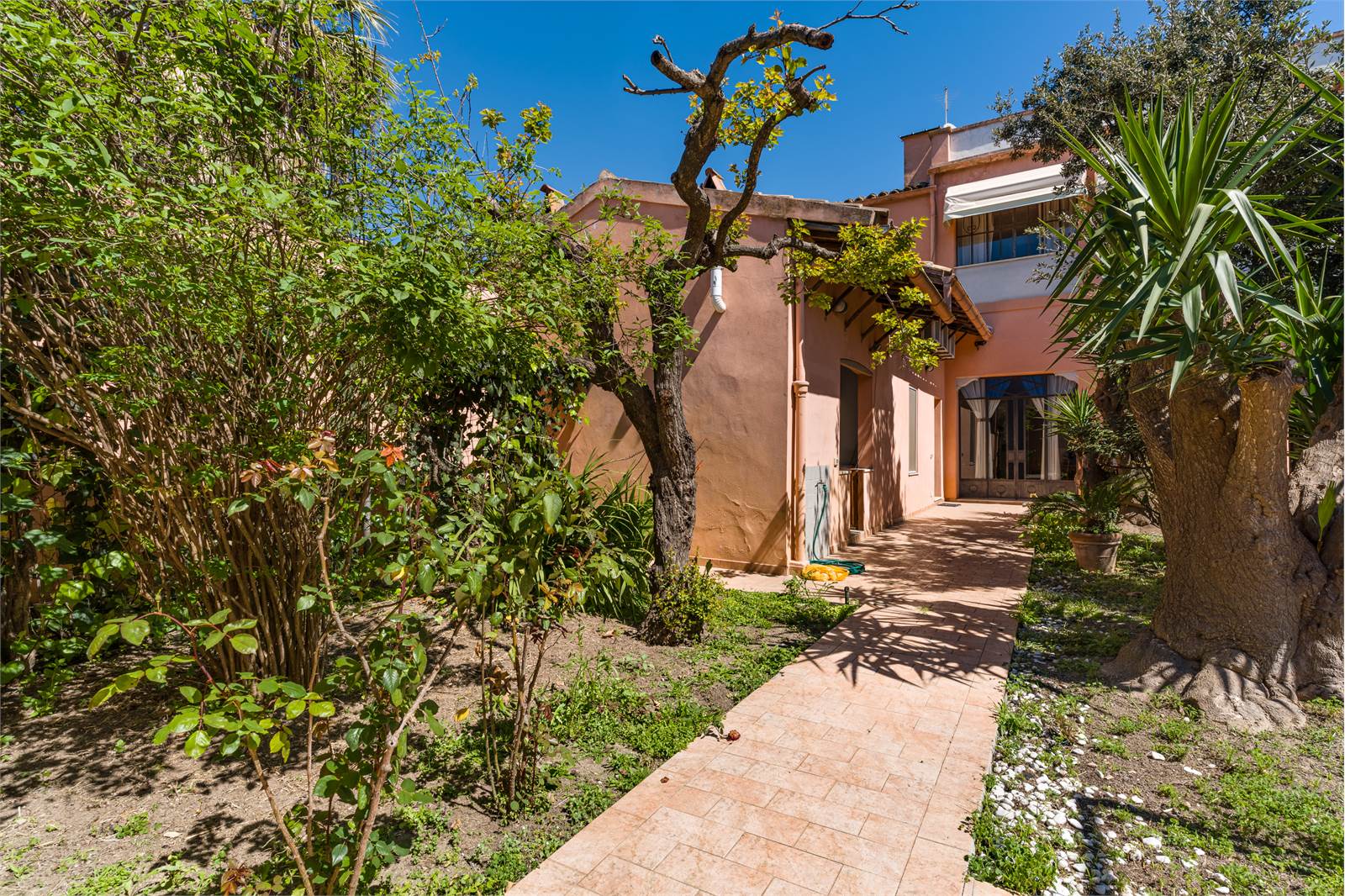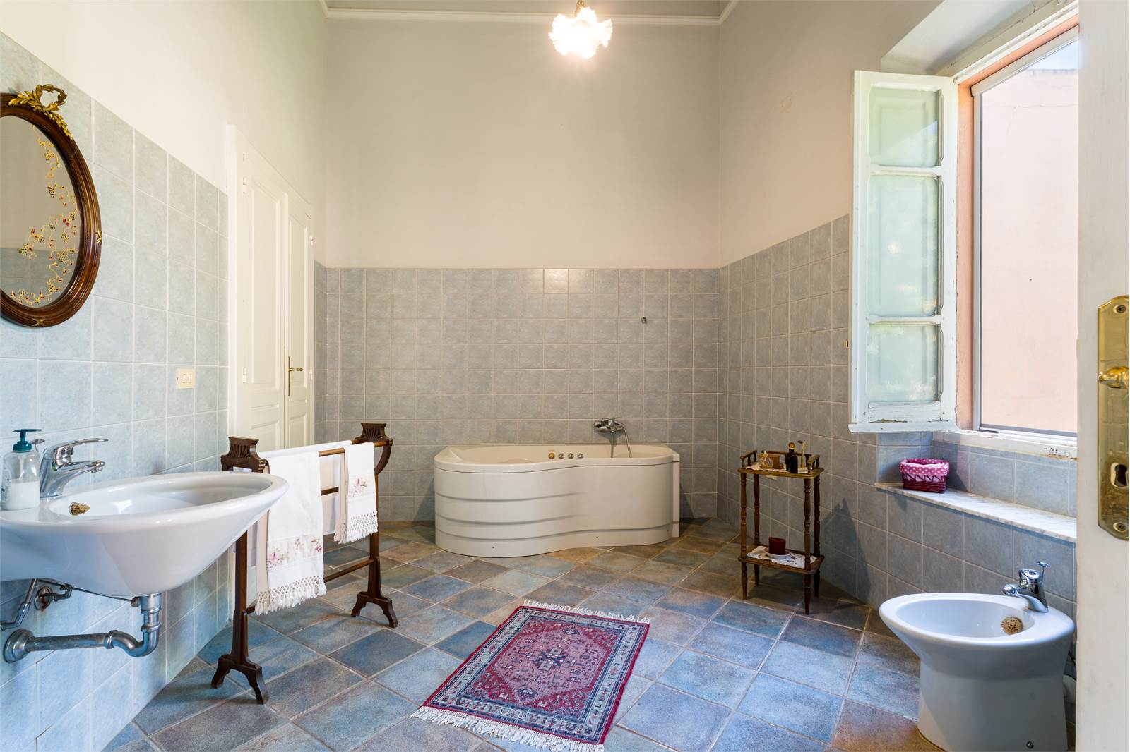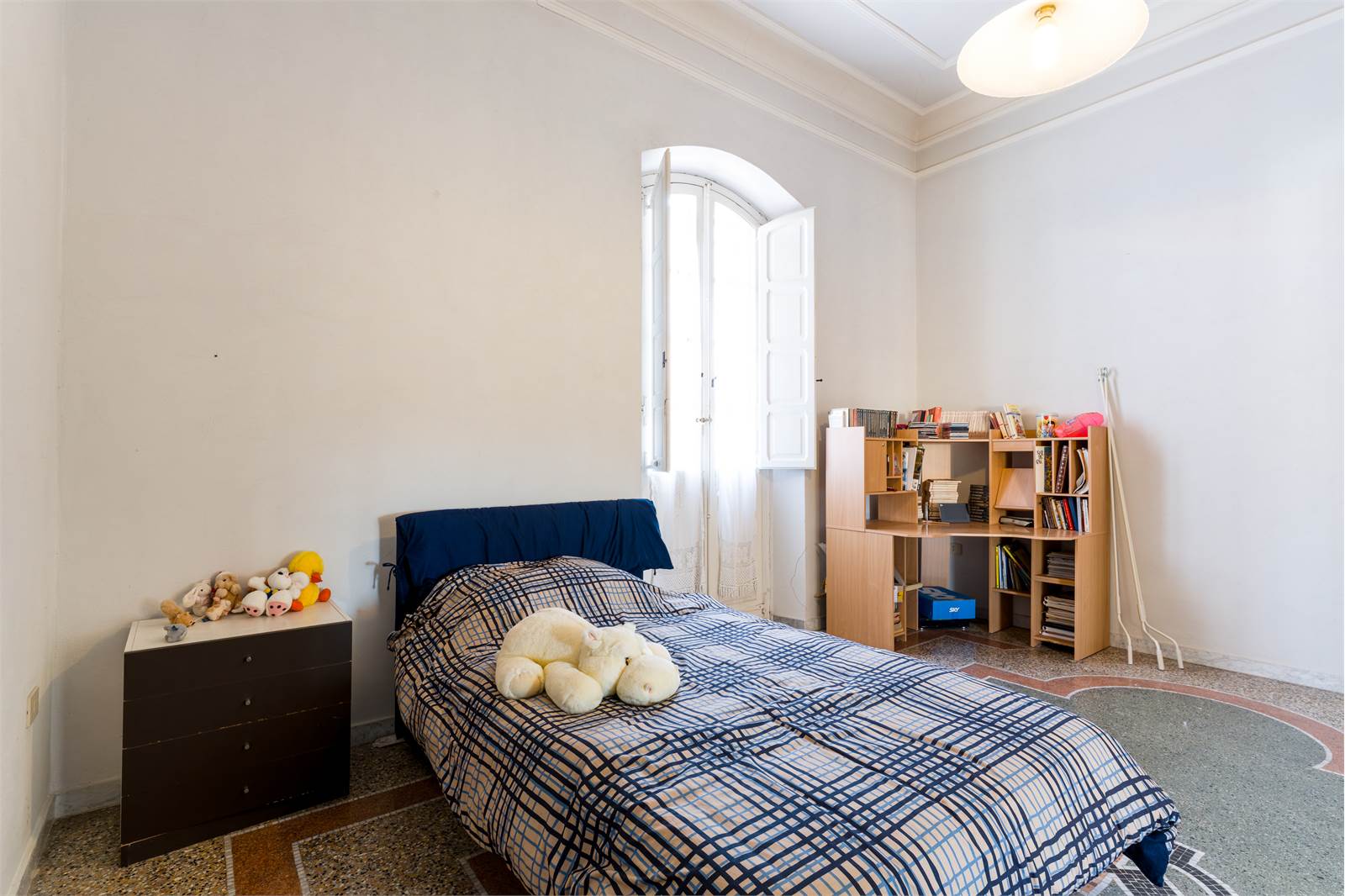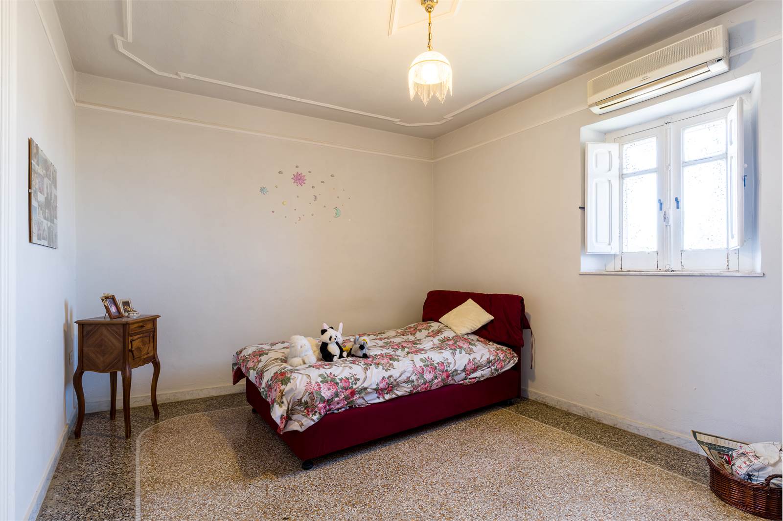 Gli interni conservano dettagli d'epoca di raro pregio: soffitti decorati con cornici in stucco e riquadrature geometriche dipinte, infissi in ferro battuto lavorato con archetti e motivi floreali, pavimenti in graniglia e marmo lucidato. Ogni ambiente racconta la cura costruttiva di un'epoca in cui l'architettura era anche arte.